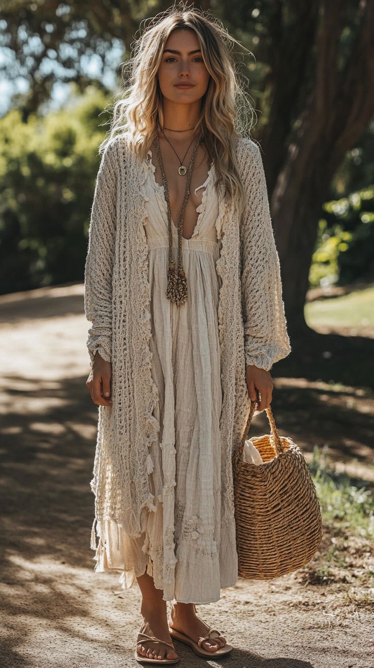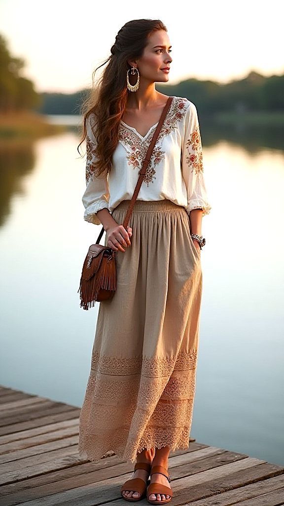 • Літня прогулянка: довга сукня-максі з квітковим принтом, плетені сандалі, солом’яний капелюх, сумка-мішок з бахромою, кілька тонких браслетів.